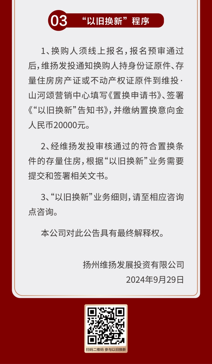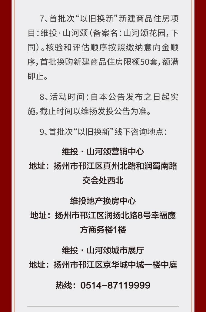 此次維揚(yáng)發(fā)投“以舊換新”工作以其自主開發(fā)的維投·山河頌項(xiàng)目為試點(diǎn),由國企背書、置換范圍廣、全流程專業(yè)服務(wù)。首批換購新建商品住房限額50套,換購人可通過登錄“維揚(yáng)發(fā)投商品住房‘以舊換新’線上報(bào)名系統(tǒng)”報(bào)名,具體要求詳見公告。