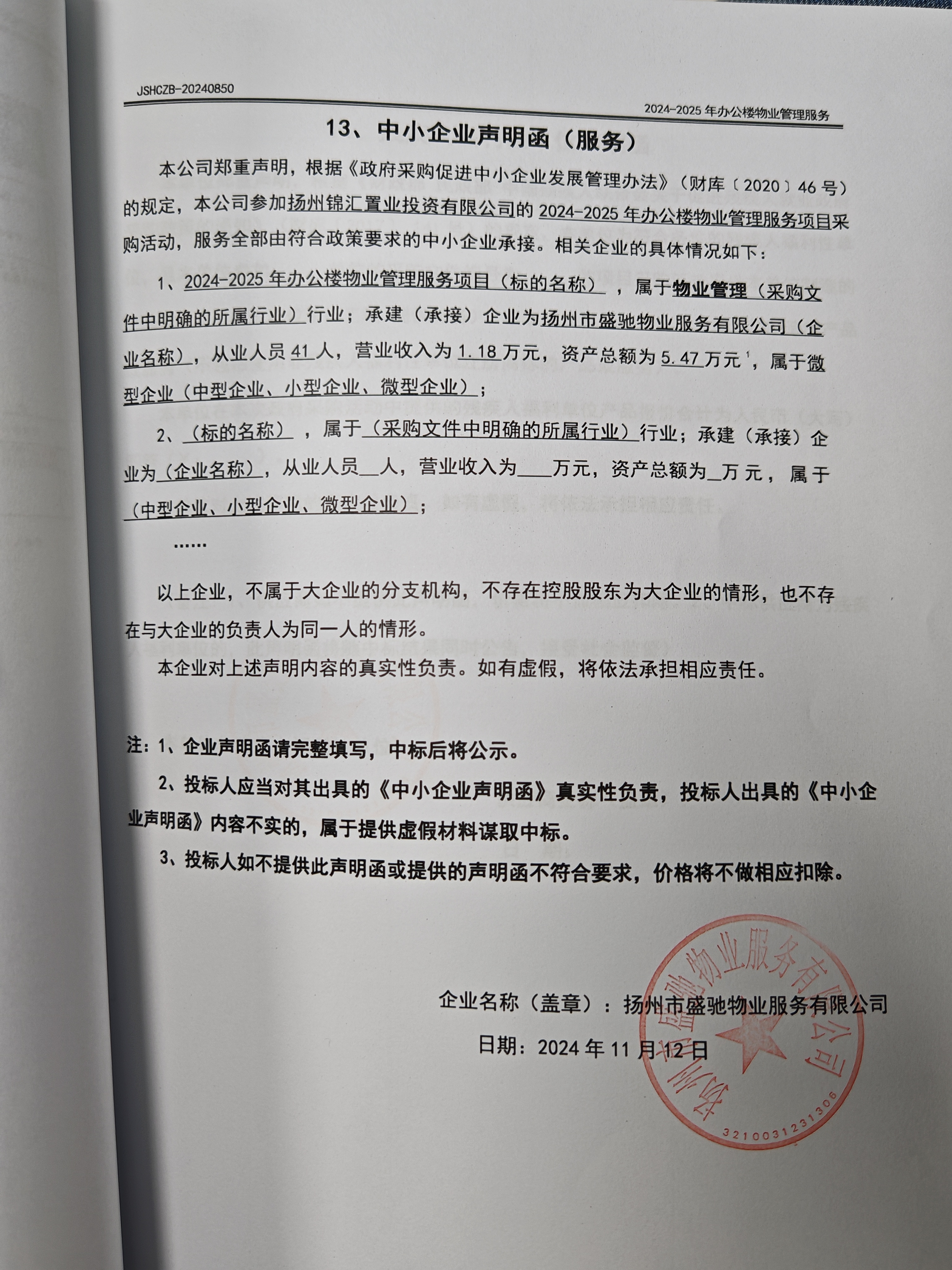 一、項目編號:JSHCZB-20240850 二、項目名稱:2024-2025年辦公樓物業(yè)管理服務 三、中標信息 序號 | 供應商名稱 | 社會信用代碼 | 供應商地址 | 中標金額 | 1 | 揚州市盛馳物業(yè)服務有限公司 | 91321003MACW5HH42R | 揚州市邗江區(qū)得祥園10幢10號 | 649580.32元 |